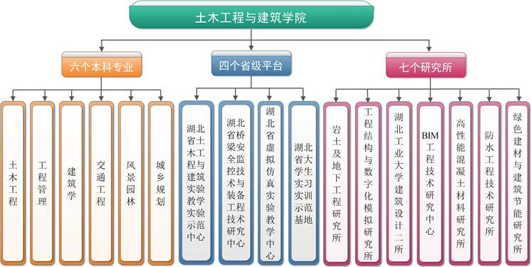 湖北工业大学土木工程与建筑学院开设有土木工程(含有建筑工程、道路与桥梁、地下工程、防水材料与工程四个方向)、工程管理、建筑学(含有建筑学、室内设计两个方向)、交通工程、风景园林和城乡规划6个本科专业。其中,土木工程一级学科为湖北省重点学科、湖北省特色学科,结构工程二级学科为湖北省有突出成就的创新学科。有四个省级平台——湖北省土木工程与建筑实验教学实验示范中心、湖北省桥梁安全监控技术与装备工程技术研究中心、湖北省虚拟仿真实验教学中心、湖北省大学生实习实训示范基地,有七个研究所——岩土及地下工程研究所、工程结构与数字化模拟研究所、湖北工业大学建筑设计二所、BIM工程技术研究中心、高性能混凝土材料研究所、防水工程技术研究所、绿色建材与建筑节能研究所,学院组织结构如图1所示。