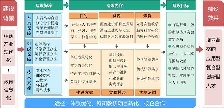 湖北工业大学土木工程与建筑虚拟仿真实验教学中心的建设是在建筑产业转型和教育信息化的大背景下实施的。中心秉承“集中校企优势资源,高度融合学生需掌握的专业基础知识、基本技能训练与行业前沿科学技术,覆盖建设项目全寿命周期,实现资源高度共建共享, 培养具有强烈创新意识和实践能力的土木工程与建筑类专业技术人才”的建设理念。