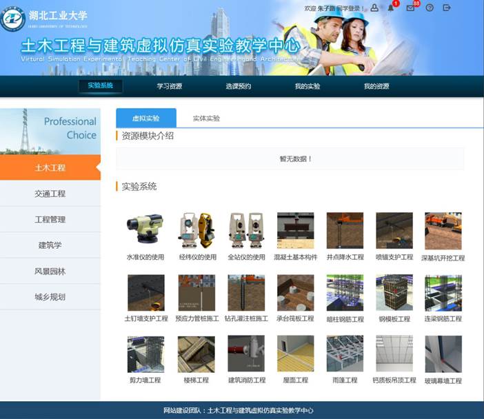 中心的建设思路紧紧围绕教育部“科学规划、共享资源、突出重点、提高效益、持续发展”的指导思想,着眼建筑产业现代化,以绿色建筑、建筑信息化、新型工业化等技术为导向,以促进学生创新能力和实践能力培养为宗旨,遵循土建类各学科专业教学规律和要求,系统规划了“学科基础”、“专业应用”、“自主创新”三个层次的虚拟仿真实验教学资源,内容涵盖“基础技能”、“规划与设计”、“施工与管理”、“运营与维护”、“产业前沿”、“实践探索”等六个模块。