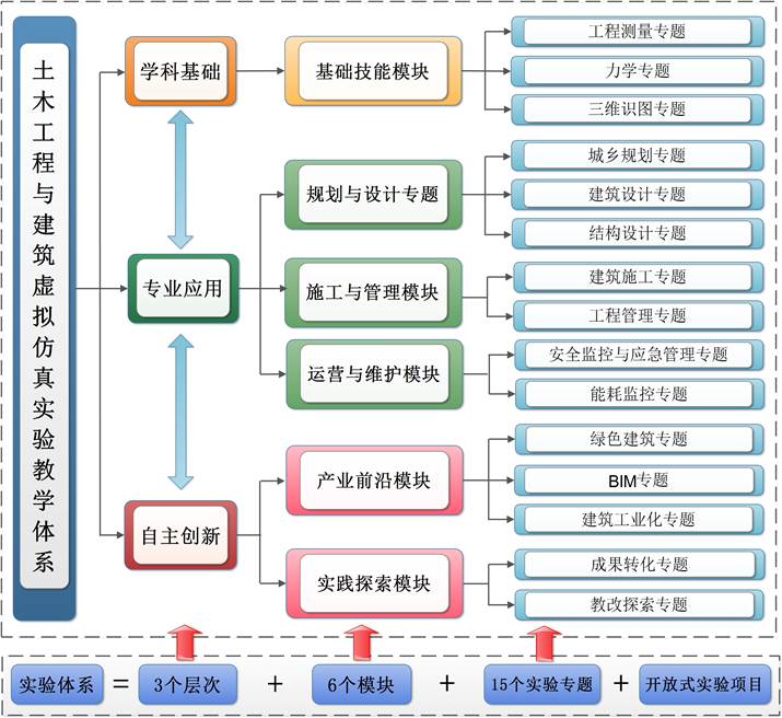 “3-6-15-X”虚拟仿真实验体系的含义为3个层次,6大模块,15个实验专题和若干个开放式实验项目。为适应建筑产业转型和学科发展,各模块下的实验项目可以逐渐拓展或动态改进,形成了开放式的实验体系。中心根据建筑产业发展特征和相关学科特点,借助教师雄厚的教学科研实力和良好的产学研合作平台,利用虚拟现实、网络、人机交互等信息化技术,针对传统实验室中无法完成,或具有高风险和高成本的土木工程与建筑类实验教学项目,规划了面向“学科基础、专业应用和自主创新”3个层次的6大虚拟仿真实验教学模块,开设了15个教学专题,多个实验项目,形成了“3-6-15-X”虚拟仿真实验教学网络体系,如图6所示。