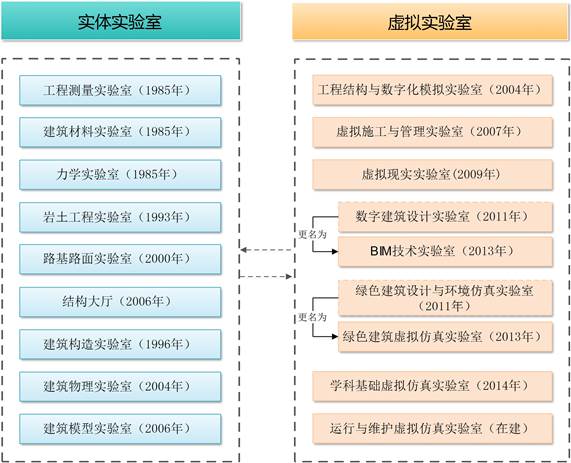 中心以与土建行业设计、施工、虚拟仿真设备标杆企业合作为契机,以计算机技术、信息技术、网络技术和BIM技术为支撑,以“教师典型科研成果、特色工程案例转化成实验教学内容”为创新手段,不断丰富虚拟仿真实验教学内容,壮大教学队伍和软硬件投入。针对土木工程与建筑类实体实验中无法完成,或具有高成本、高风险、不可逆的实验教学功能,中心启动了仿真实验项目的研发,并于2009年成立了虚拟现实实验室。2011年,中心与美国欧特克、法国达索等世界知名软件公司合作,增设了绿色建筑设计与环境仿真分析、数字建筑设计等实验室。2012年,为进一步推进绿色建筑的发展,中心组建了涵盖规划、设计、施工与管理等阶段的仿真实验教学平台。
