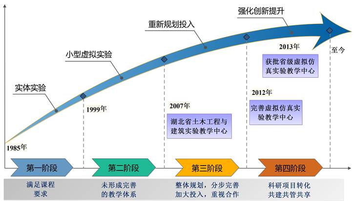 随着实验教学任务加重和土建行业新兴技术的发展,实体实验室增设了建筑结构实验室、建筑模型实验室和建筑物理实验室。为适应土建行业信息化技术发展,中心从上世纪末开始逐步设立了工程结构与数字化模拟、虚拟施工与管理等实验室。规划开发了测量(水准仪、经纬仪)、地基与基础工程施工、砌体与模板工程的小型虚拟实验教学项目。2007年,湖北工业大学土木工程与建筑实验教学中心被评为湖北省实验教学示范中心。