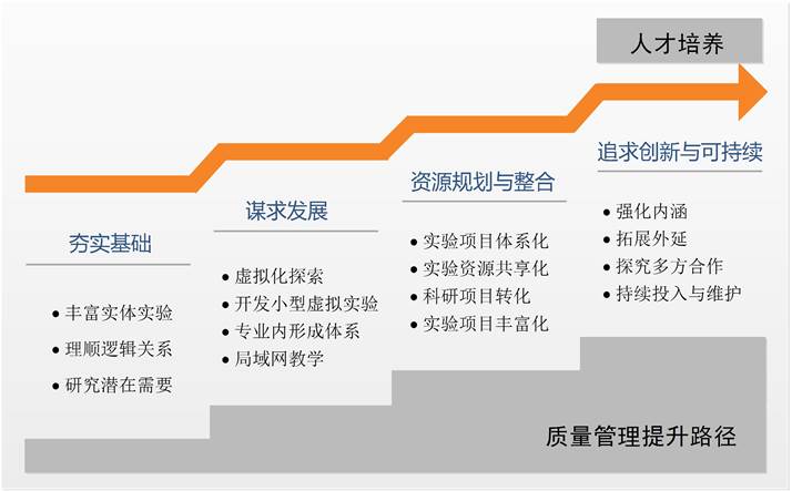 学校虚拟仿真实验教学中心的发展历程也体现了中心的质量管理提升路径,如图5所示。经过多年发展建设,通过自主研发、校企联合开发等形式,已建成服务于多个学院、十余个专业的15个虚拟仿真实验教学专题、78个虚拟仿真实验项目,其中自主研发项目32个;另有8个虚拟仿真实验项目在建。近三年实验教学工作量约21.5万人时。目前,中心已基本满足校内外相关专业的实验需求,并在校校、校企多途径合作方面发挥重要作用。