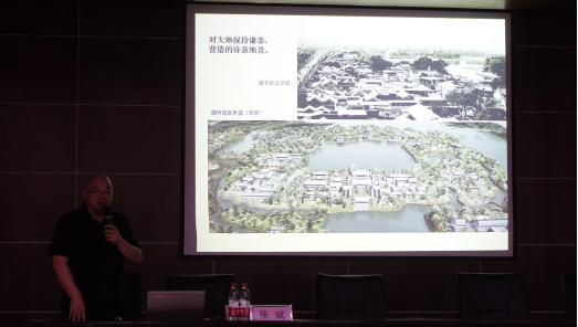 张斌教授首先用诙谐幽默的方式引出了地景的相关概念以及在我国一些山水园林格局城市中的营造方式,介绍了地景的营造在景观设计中的重要性。然后从“地景营造与大地”、“地景营造与身体”、“地景营造与生活”三个方面进行了分别阐述。通过大量的国内外经典案例,具体讲解了地景营造过程中应该如何梳理场地现状、挖掘文脉与历史、注重人的感受与尺度、考虑人的使用功能等。