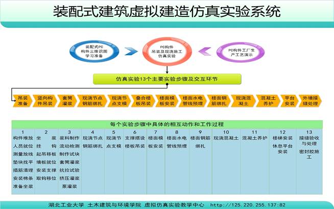 学生通过佩戴VR眼镜,在实验系统中进行剪力墙的吊装施工实验,分为吊装准备、竖向构件吊装、套筒灌浆、现浇节点钢筋绑扎、现浇节点支模、叠合楼板吊装、楼面模板吊装、楼面水电管线预埋、楼面钢筋绑扎、现浇混凝土、混凝土养护、平台安装和外墙接缝处理13个主要步骤,具体如图所示: