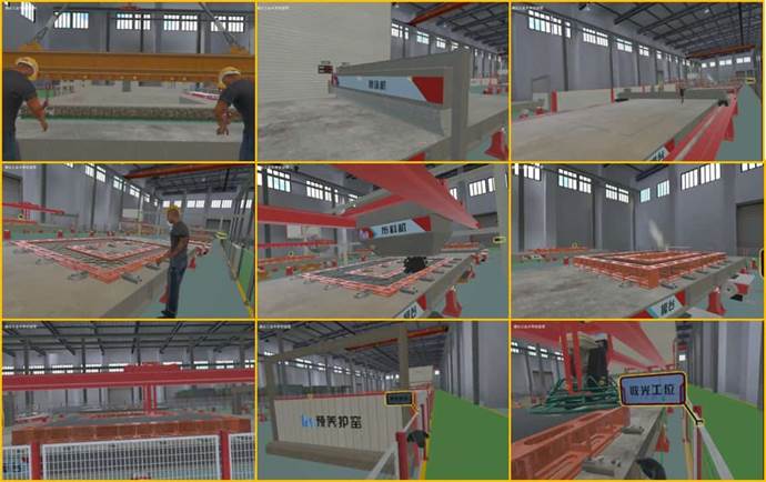 以PC墙体为例,主要包括生产车间布局VR浏览和16个工位的虚拟仿真操作,其流程如图所示。